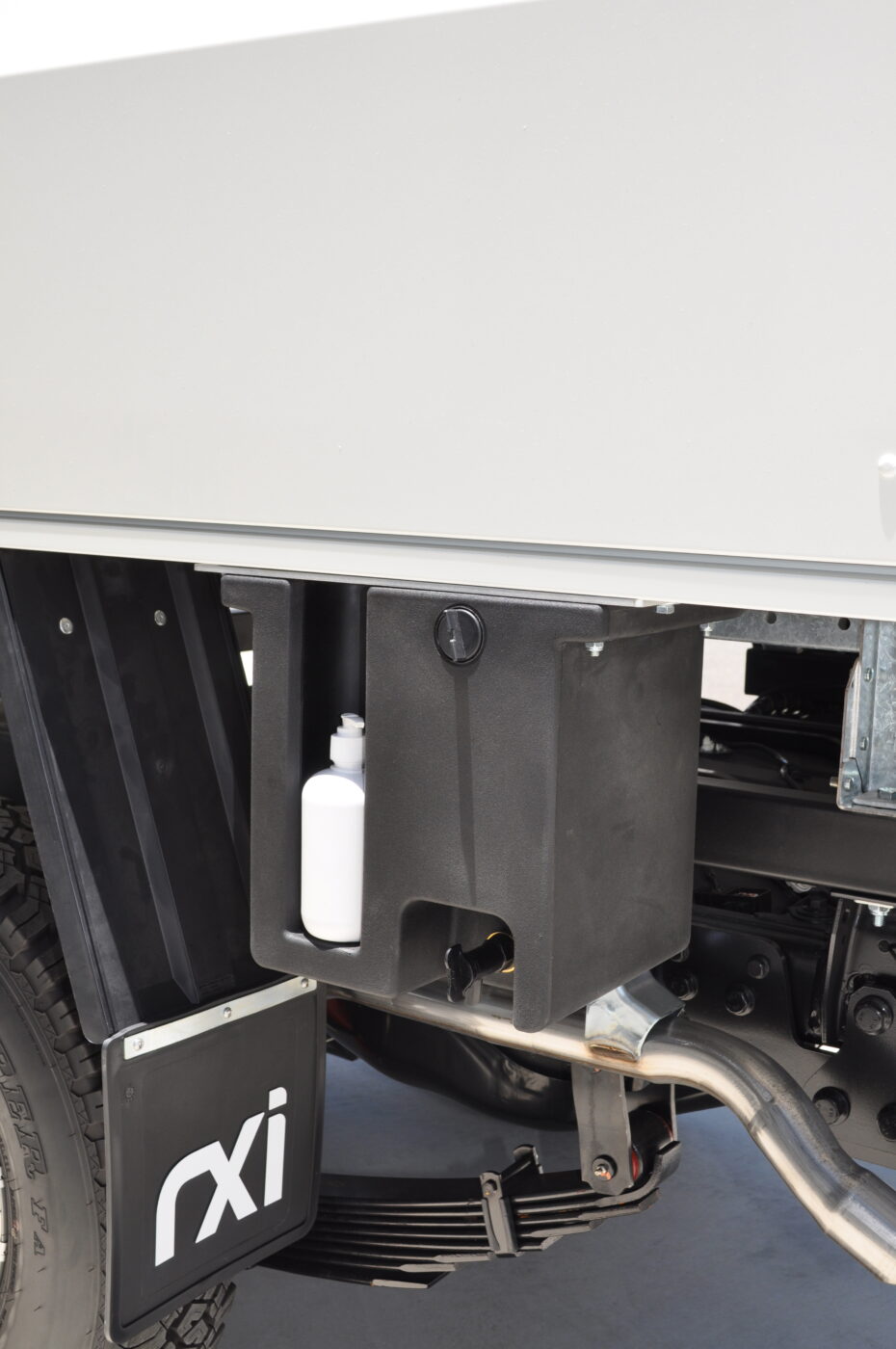 - Heavy-duty compliant mounting kit with integrated fuel filler assembly, mudguards, mudflaps, and upgraded full-width tail light channel with reverse sensor capability.