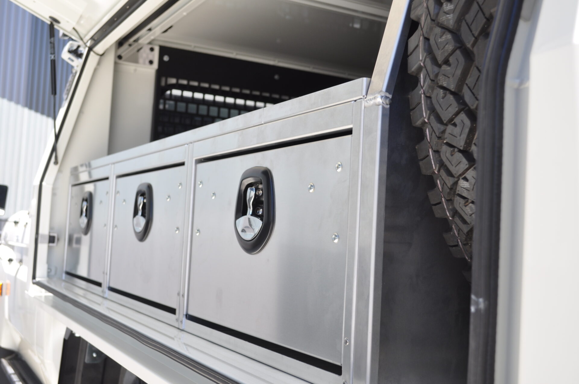 - Underbody aluminium storage box and retaining angle system to secure and stabilise internal drawer units.