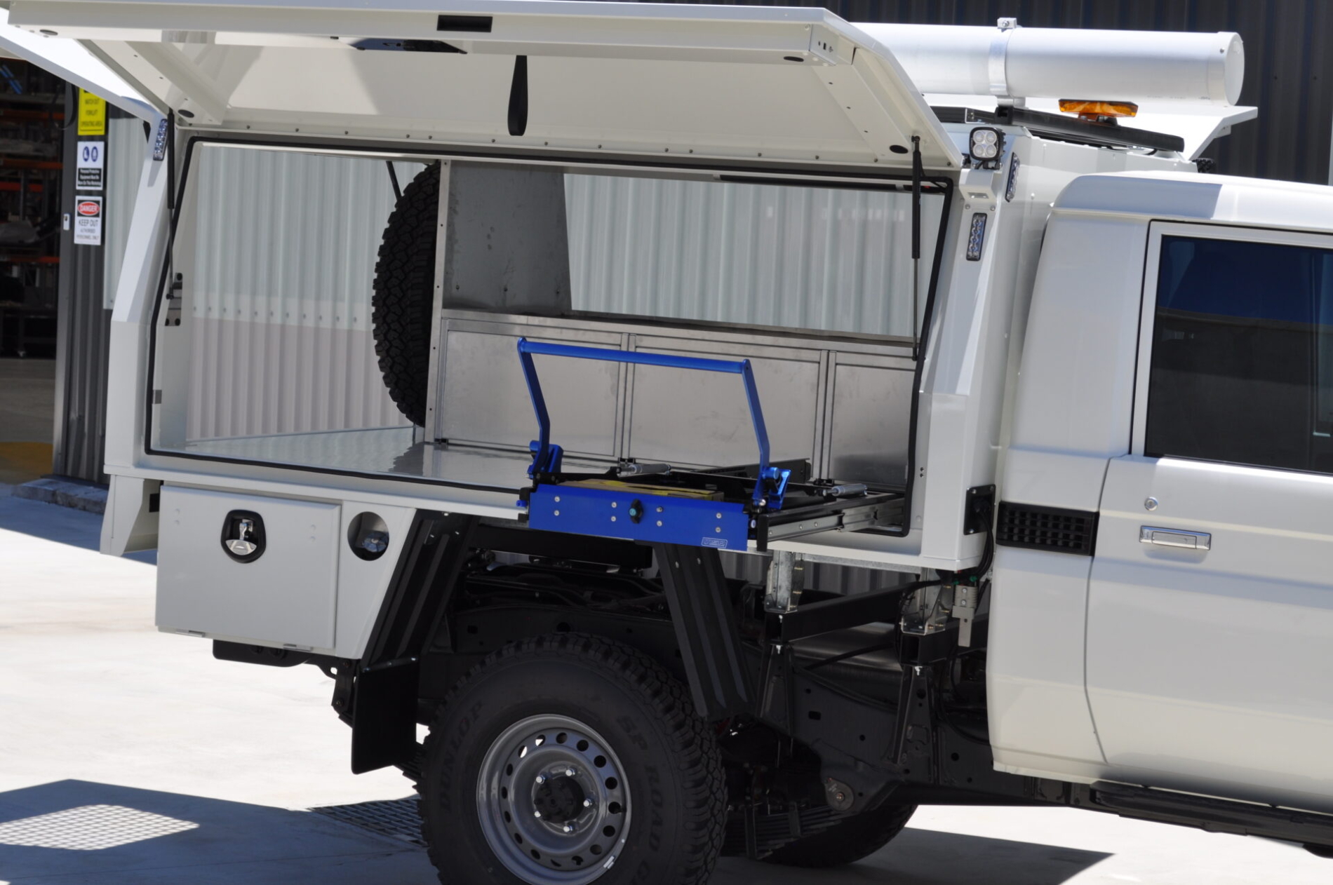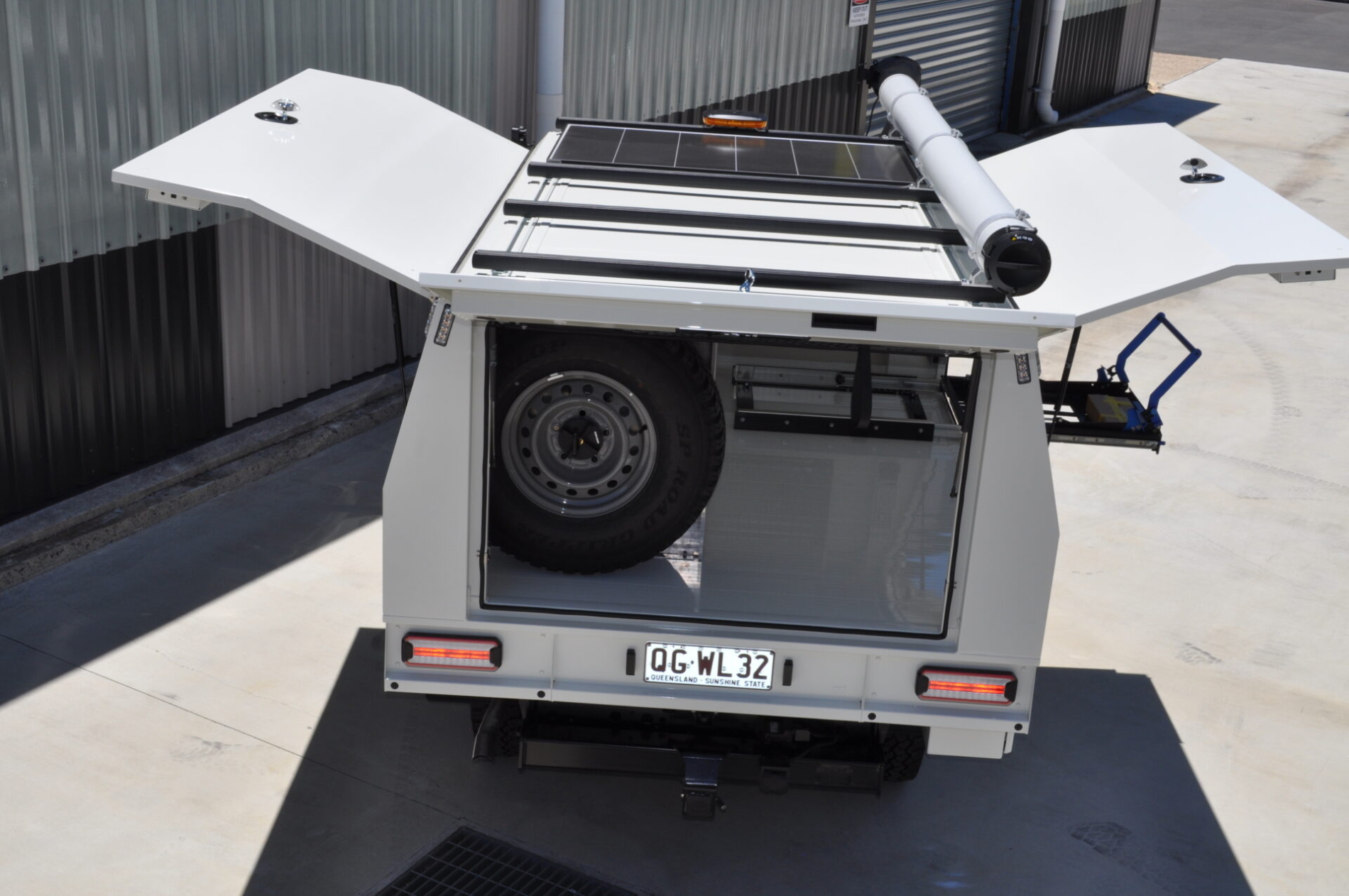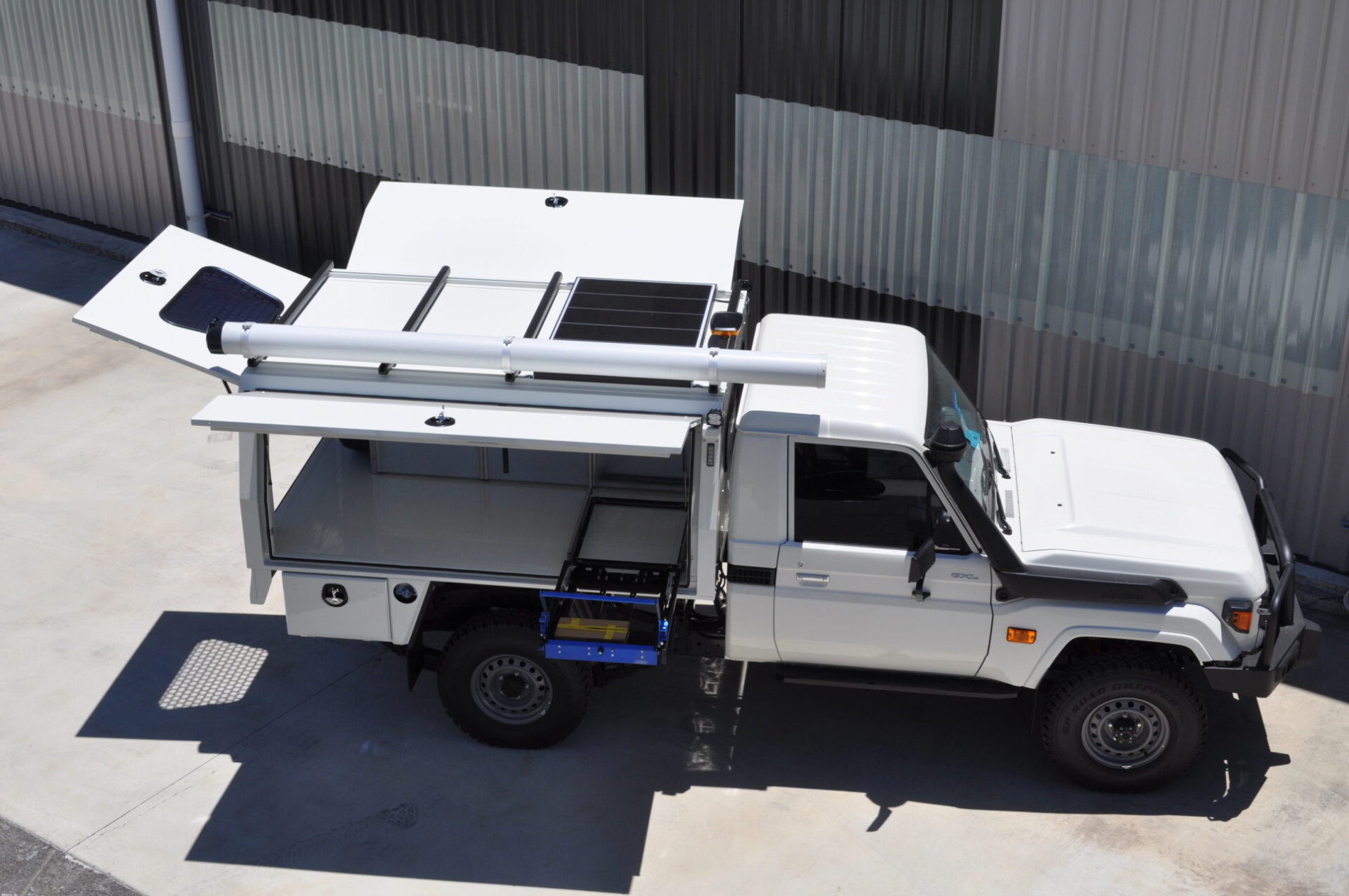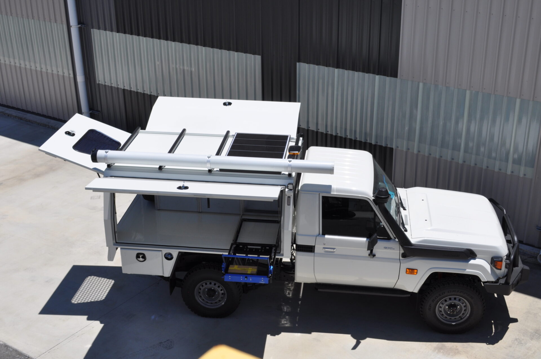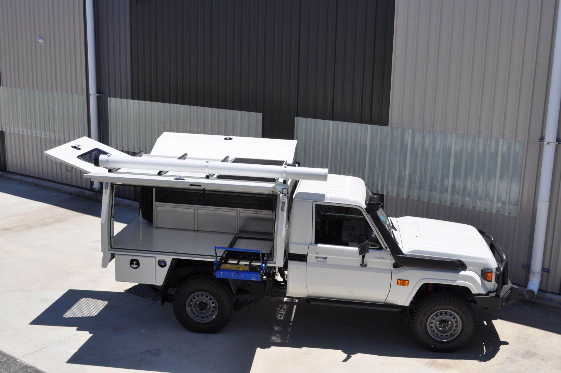 - Full body Canopex aluminium service body (2400L x 1850W x 1000H) with powered gullwing side doors, powered rear door with acrylic window, and colour-matched 2Pak French Vanilla finish.