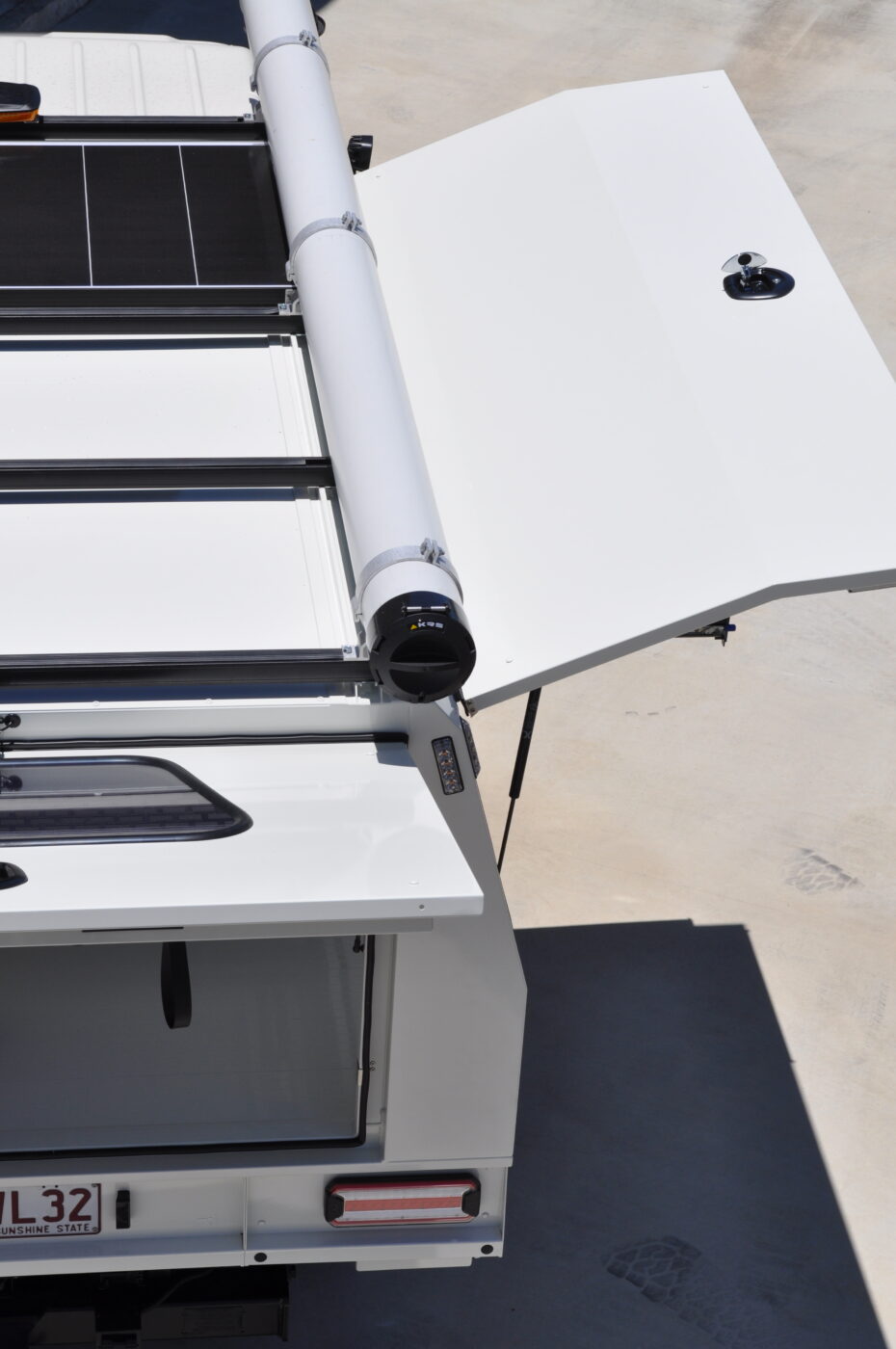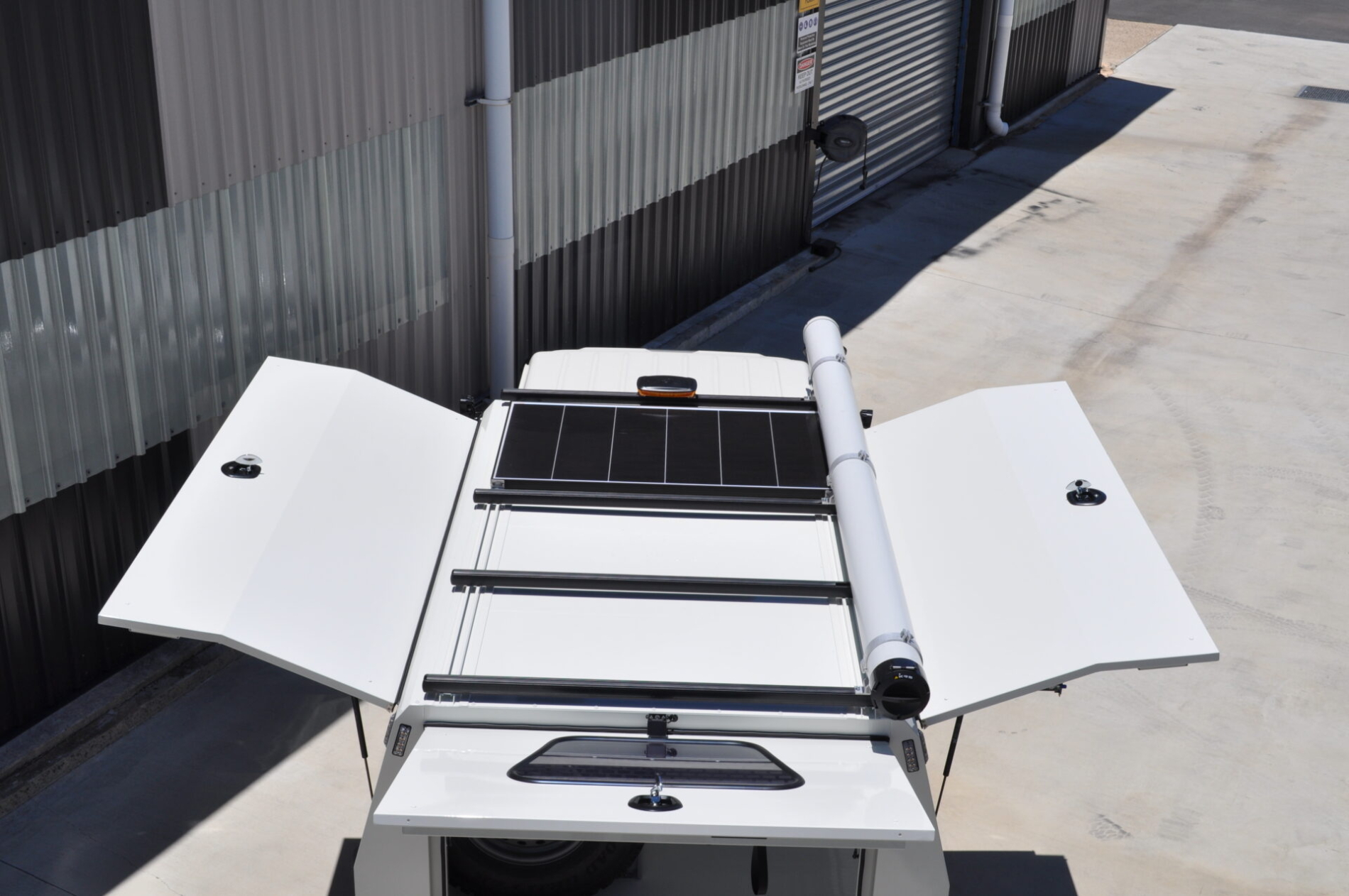 - 200W monocrystalline solar panel mounted to roof, with cabling provision for customer-supplied dual battery system.
